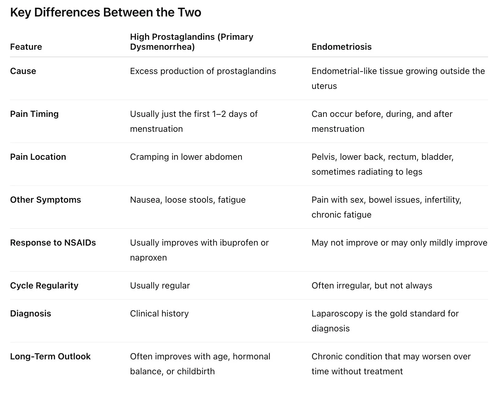 For many women, period pain is a common, though frustrating, part of the menstrual cycle. But when cramps become intense, debilitating, or interfere with daily life, it’s essential to look deeper. Two common causes of painful periods are endometriosis and elevated prostaglandins. While the symptoms may appear similar at first, the underlying causes and long-term implications are very different.