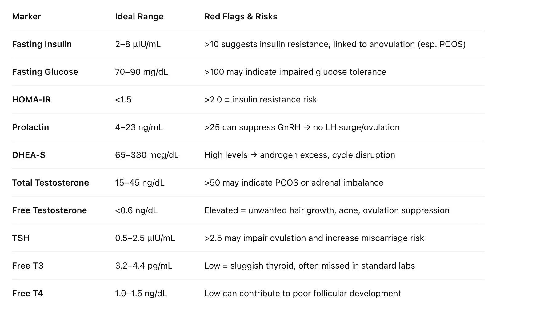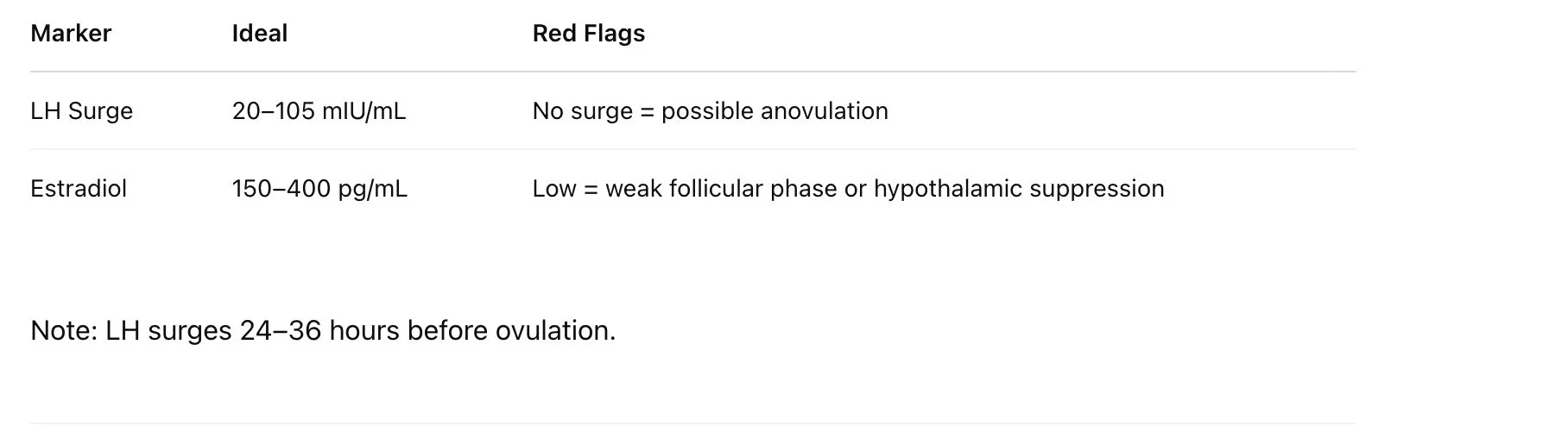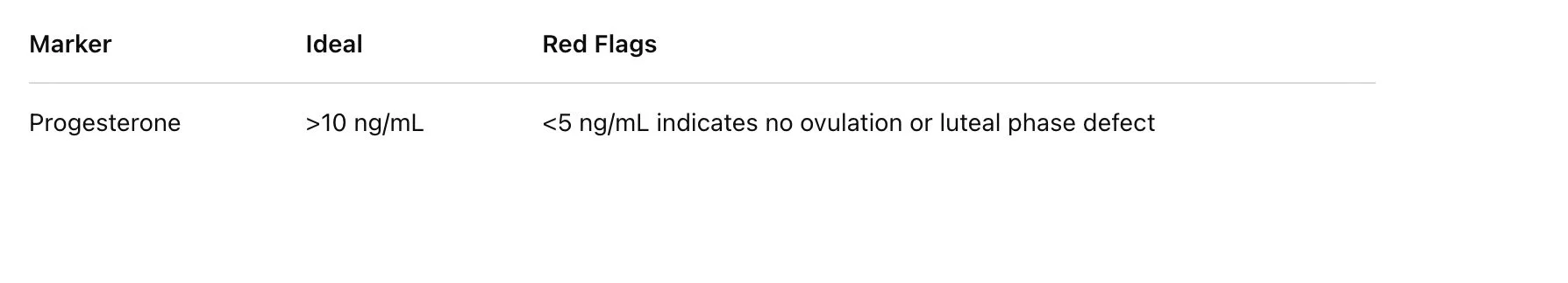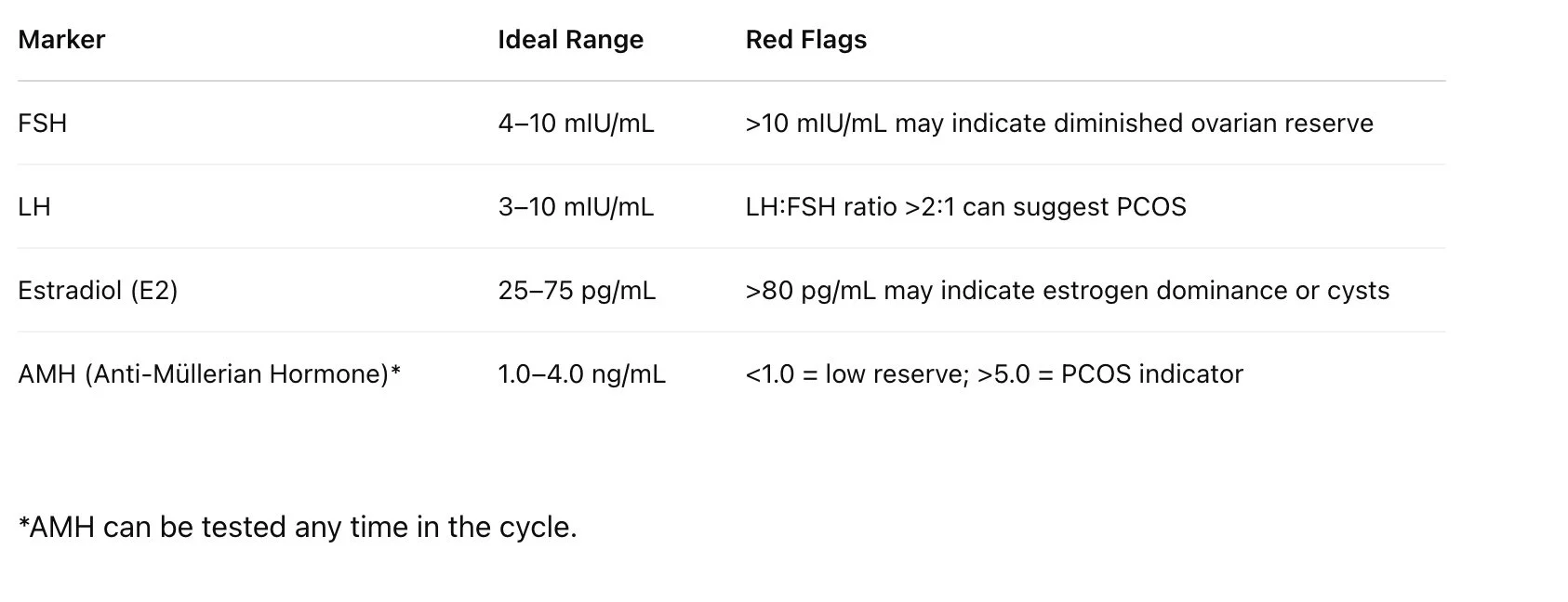 Clinicians often use cycle-specific bloodwork to evaluate ovulation and cycle health. Below is a breakdown of relevant panels, when to test, ideal ranges, and red flags to watch for.